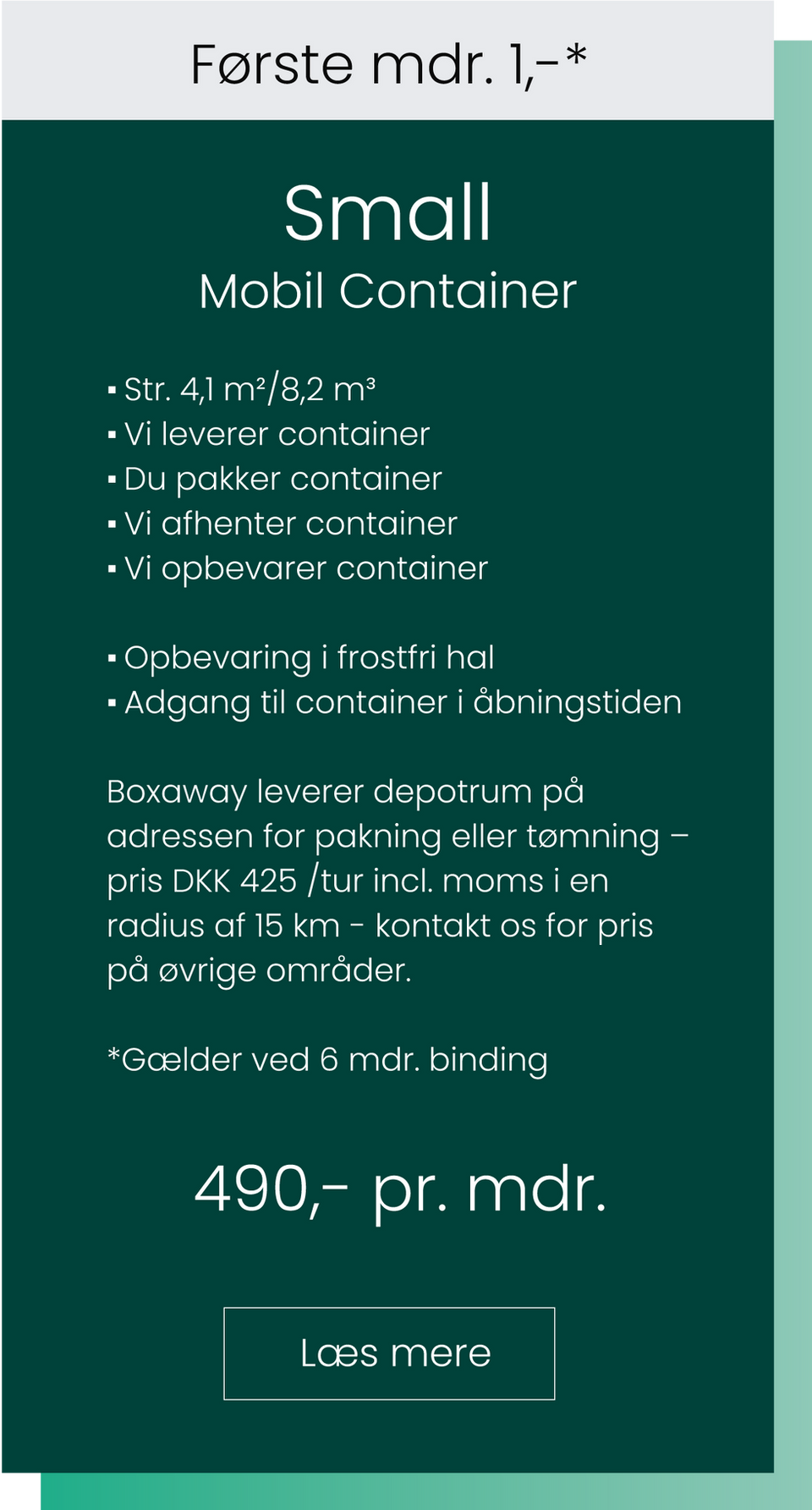 Boxaway leverer depotrum på adressen for pakning eller tømning – pris DKK 425 /tur incl. moms i en radius af 15 km - kontakt os for pris på øvrige områder.